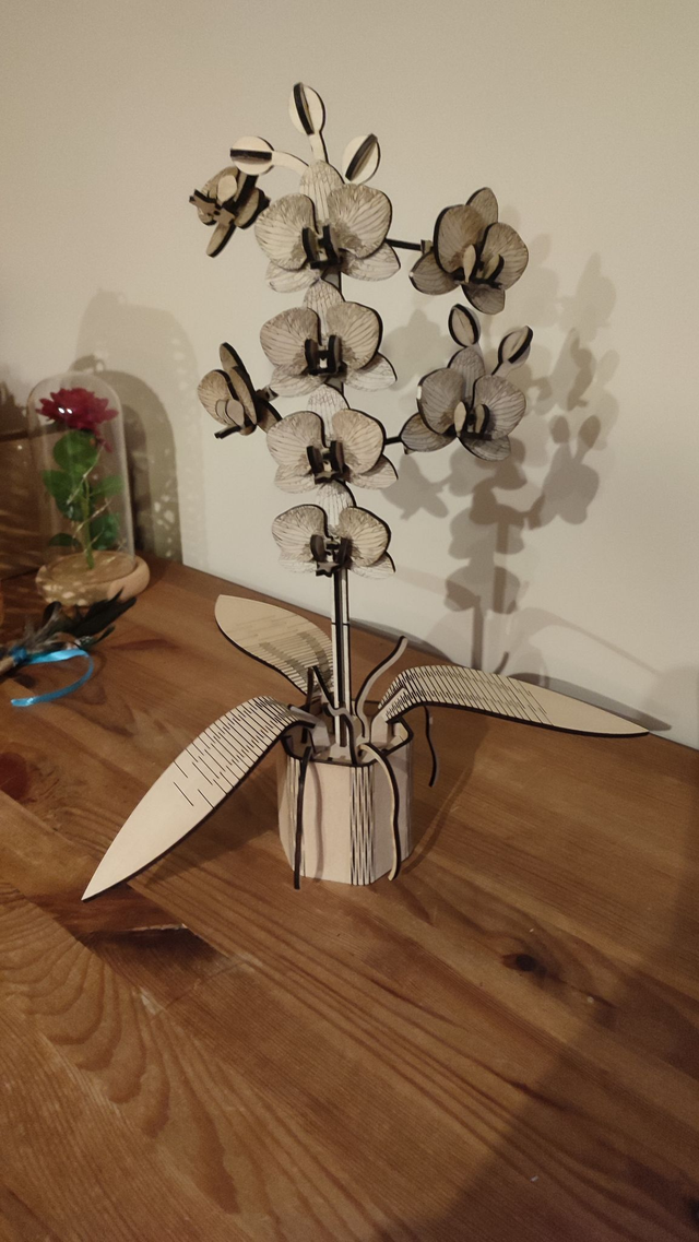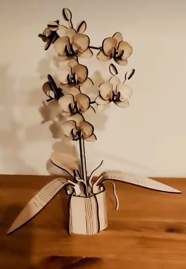 Ajoutez une touche d'élégance à votre intérieur avec cette magnifique orchidée en bois, soigneusement conçue à la main. Composée de 8 fleurs délicates en contreplaqué de tilleul, chaque pièce est découpée et gravée artisanalement au laser.